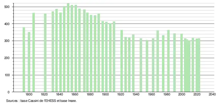 | L'évolution du nombre d'habitants est connue à travers les recensements de la population effectués dans la commune depuis 1793. Pour les communes de moins de 10 000 habitants, une enquête de recensement portant sur toute la population est réalisée tous les cinq ans, les populations de référence des années intermédiaires étant quant à elles estimées par interpolation ou extrapolation[27]. Pour la commune, le premier recensement exhaustif entrant dans le cadre du nouveau dispositif a été réalisé en 2004[28]. En 2022, la commune comptait 314 habitants[Note 5], en évolution de −0,95 % par rapport à 2016 (Hautes-Pyrénées : +1,59 %, France hors Mayotte : +2,11 %). |