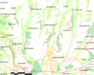 Les communes les plus proches[Note 1] sont[4] : Houeydets (2,2 km), Lannemezan (3,2 km), Clarens (3,3 km), Castelbajac (3,8 km), Lagrange (3,8 km), Bégole (4,0 km), Bonrepos (4,5 km), Lutilhous (4,6 km).