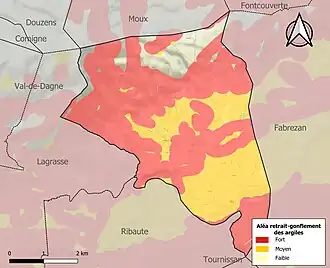 Le retrait-gonflement des sols argileux est susceptible d'engendrer des dommages importants aux bâtiments en cas d’alternance de périodes de sécheresse et de pluie. 89,3 % de la superficie communale est en aléa moyen ou fort (75,2 % au niveau départemental et 48,5 % au niveau national). Sur les 247 bâtiments dénombrés sur la commune en 2019, 247 sont en aléa moyen ou fort, soit 100 %, à comparer aux 94 % au niveau départemental et 54 % au niveau national. Une cartographie de l'exposition du territoire national au retrait gonflement des sols argileux est disponible sur le site du BRGM[30],[Carte 3].