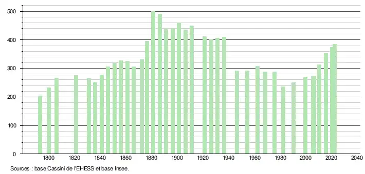 L'évolution du nombre d'habitants est connue à travers les recensements de la population effectués dans la commune depuis 1793. Pour les communes de moins de 10 000 habitants, une enquête de recensement portant sur toute la population est réalisée tous les cinq ans, les populations de référence des années intermédiaires étant quant à elles estimées par interpolation ou extrapolation[36]. Pour la commune, le premier recensement exhaustif entrant dans le cadre du nouveau dispositif a été réalisé en 2005[37].