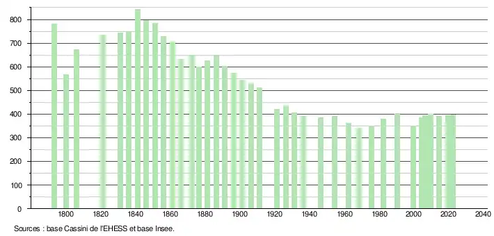 - ↑ Population municipale de référence en vigueur au 1er janvier 2025, millésimée 2022, définie dans les limites territoriales en vigueur au 1er janvier 2024, date de référence statistique : 1er janvier 2022.