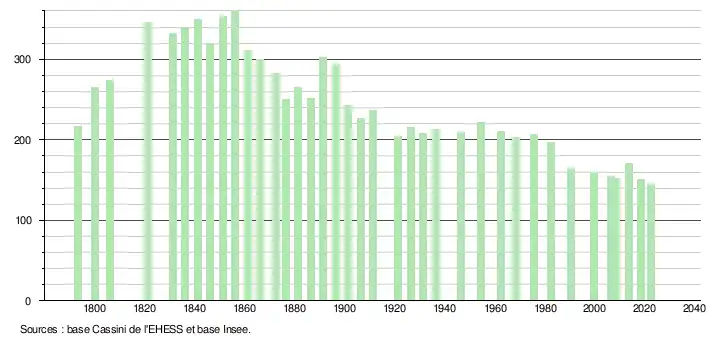 | L'évolution du nombre d'habitants est connue à travers les recensements de la population effectués dans la commune depuis 1793. Pour les communes de moins de 10 000 habitants, une enquête de recensement portant sur toute la population est réalisée tous les cinq ans, les populations de référence des années intermédiaires étant quant à elles estimées par interpolation ou extrapolation[26]. Pour la commune, le premier recensement exhaustif entrant dans le cadre du nouveau dispositif a été réalisé en 2008[27]. En 2022, la commune comptait 144 habitants[Note 5], en évolution de −11,66 % par rapport à 2016 (Hautes-Pyrénées : +1,59 %, France hors Mayotte : +2,11 %). |