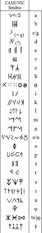 Les lettres de l'alphabet camunien ont été notamment étudiées dans la commune de Paspardo, à la suite de quoi des transcriptions en alphabets grec et latin ont été proposées[5] :