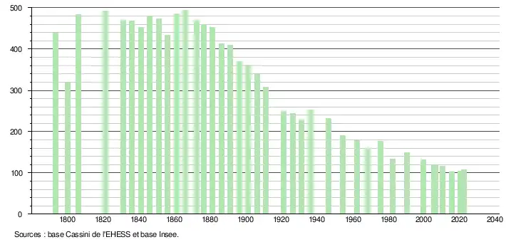 - ↑ Population municipale de référence en vigueur au 1er janvier 2025, millésimée 2022, définie dans les limites territoriales en vigueur au 1er janvier 2024, date de référence statistique : 1er janvier 2022.
