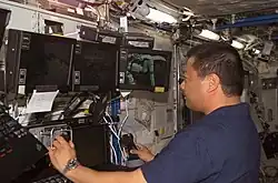 L'astronaute Leroy Chiao utilisant une station de contrôle du Canadarm 2 dans le module laboratoire Destiny.