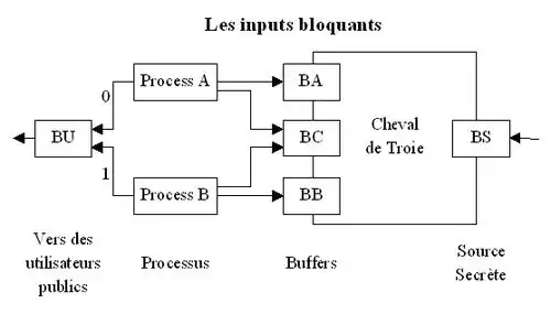 Lorsque les processus A et B sont bloqués (buffers respectifs BA et BB saturés), le Cheval de Troie lit un bit dans le buffer BS. Si le message lu est égal à 0, alors A est débloqué ; ce dernier écrit un 0 dans BU puis envoie un message dans BC pour informer le Cheval de Troie que le transfert est réalisé. Si le message lu est égal à 1, alors B est débloqué ; il écrit un 1 dans BU puis envoie un message dans BC pour informer le Cheval de Troie que le transfert est réalisé. Le Cheval de Troie a bien transféré le contenu de BS dans BU.