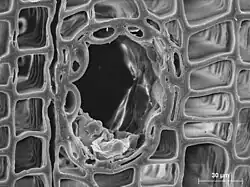 - axiale : issus des initiales fusiformes du cambium, ils sont disséminés dans les trachéides axiales, conduisant la sève brute ;