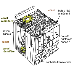 Les canaux résinifères normaux sont formés chaque année par le cambium, plutôt à la fin de la saison de végétation[2]. Ils sont nombreux et régulièrement répartis dans la masse du bois.