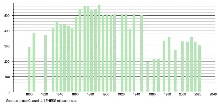 L'évolution du nombre d'habitants est connue à travers les recensements de la population effectués dans la commune depuis 1800. Pour les communes de moins de 10 000 habitants, une enquête de recensement portant sur toute la population est réalisée tous les cinq ans, les populations de référence des années intermédiaires étant quant à elles estimées par interpolation ou extrapolation[8]. Pour la commune, le premier recensement exhaustif entrant dans le cadre du nouveau dispositif a été réalisé en 2006[9].