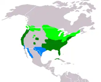 Cette espèce se rencontre principalement sur les côtes est et ouest des États-Unis, mais aussi au Mexique et jusqu'au Canada en période de reproduction.