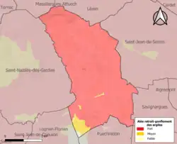 Le retrait-gonflement des sols argileux est susceptible d'engendrer des dommages importants aux bâtiments en cas d’alternance de périodes de sécheresse et de pluie. 99,6 % de la superficie communale est en aléa moyen ou fort (67,5 % au niveau départemental et 48,5 % au niveau national). Sur les 211 bâtiments dénombrés sur la commune en 2019, 211 sont en aléa moyen ou fort, soit 100 %, à comparer aux 90 % au niveau départemental et 54 % au niveau national. Une cartographie de l'exposition du territoire national au retrait gonflement des sols argileux est disponible sur le site du BRGM[14],[Carte 2].