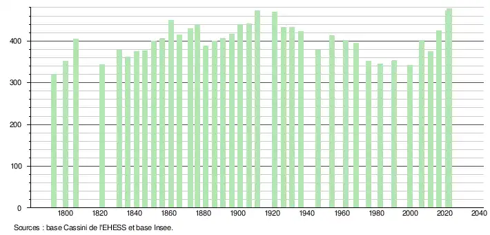 L'évolution du nombre d'habitants est connue à travers les recensements de la population effectués dans la commune depuis 1793. Pour les communes de moins de 10 000 habitants, une enquête de recensement portant sur toute la population est réalisée tous les cinq ans, les populations de référence des années intermédiaires étant quant à elles estimées par interpolation ou extrapolation[21]. Pour la commune, le premier recensement exhaustif entrant dans le cadre du nouveau dispositif a été réalisé en 2006[22].