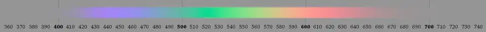Spectre visible sur fond grisé. Le maximum de sensibilité de l'œil se situe vers 555 nm. - Une bougie a un éclat d'approximativement 1 cd dans le plan horizontal ; c'est pour conserver la grandeur correspondant à d'anciennes définitions de l'intensité lumineuse, réalisées avec des bougies que les définitions successives de la candela ont été choisies.