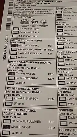 Les victoires de candidats par écrit sont très rares au Congrès des États-Unis. En 2010, la sénatrice républicaine d'Alaska Lisa Murkowski est réélue en tant que candidate write-in, après avoir été battue lors des primaires républicaines[3]. C'est la première victoire d'un candidat write-in au Sénat des États-Unis depuis Strom Thurmond en 1954[4]. À la Chambre des représentants, en raison de votes write-in en sa faveur, Peter Welch est à la fois candidat pour le Parti démocrate et le Parti républicain en 2008 et 2016[5].