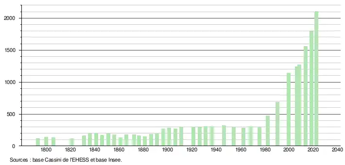 L'évolution du nombre d'habitants est connue à travers les recensements de la population effectués dans la commune depuis 1793. Pour les communes de moins de 10 000 habitants, une enquête de recensement portant sur toute la population est réalisée tous les cinq ans, les populations de référence des années intermédiaires étant quant à elles estimées par interpolation ou extrapolation[35]. Pour la commune, le premier recensement exhaustif entrant dans le cadre du nouveau dispositif a été réalisé en 2008[36].