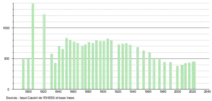 - ↑ Fiches Insee - Populations de référence de la commune pour les années 2006, 2007, 2008, 2009, 2010, 2011, 2012, 2013, 2014, 2015, 2016, 2017, 2018, 2019, 2020, 2021 et 2022.