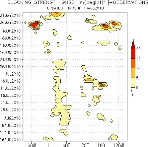 On note un blocage récurrent sur la Russie Européenne, par 40° de latitude Ouest environ. Il s'étend du 21 juin au 12 août, avec une petite interruption début juillet et autour du 7 août. Il est d'intensité faible, représenté par un aplat jaune. Il sera cependant suffisant pour maintenir durant juin, juillet, et août, un flux de sud-ouest tropical qui sera la cause de la canicule. Il peut être intéressant de souligner également un second blocage, plus intermittent, aux environs des latitudes 120° à 140° Ouest. Il sera responsable d'une autre vague de chaleur, en Sibérie orientale. Cette seconde vague de chaleur n'aura cependant pas une intensité aussi forte, et touchera une zone faiblement peuplée. Entre ces deux blocages, un temps plus froid s'établit sur la Sibérie occidentale et centrale. Cette caractéristique de l'été 2010 en Russie est nettement visible sur la carte des anomalies de températures.