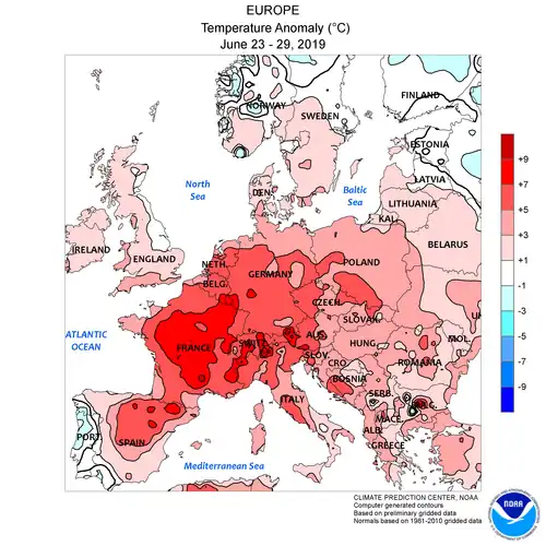 Le 27 juin est la journée la plus chaude enregistrée pour un mois de juin sur la période 1900-2019 en France avec une température moyenne de 27,9 °C (8,6 °C au-dessus de la normale)[9]. Les maximums des 26, 27 et atteignent un niveau exceptionnel de chaleur sur une large partie de l'Europe. Elles égalent ou dépassent la valeur de 35 °C. Ces trois après-midis sont les plus chauds, dans certains pays, depuis la canicule d'août 2003.
