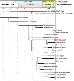 Xiaoming Wang et Richard H. Tedford ont postulé que le genre Canis était le descendant d'Eucyon davisi, qui ressemblait au coyote et dont les restes sont apparus pour la première fois au Miocène (6 millions d'années AP) dans le sud-ouest des États-Unis et au Mexique. Au Pliocène (5 millions d'années AP), le plus grand Canis lepophagus est apparu dans la même région tandis que le coyote (Canis latrans) existait à partir du Pléistocène inférieur (1 million d'années AP). Ils proposèrent que la progression de l'Eucyon davisi à C. lepophagus jusqu'au coyote soit une évolution linéaire. De plus, C. edwardii, C. latrans et C. aureus forment ensemble un petit clade[Information douteuse] et parce que C. edwardii est apparu le plus tôt, s'étendant du milieu du Blancan (fin du Pliocène) jusqu'à la fin de l'Irvingtonien (Pléistocène supérieur), ce dernier est proposé comme ancêtre[3].