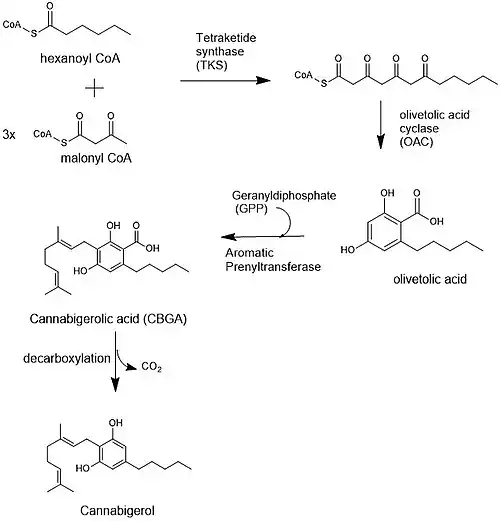 La biosynthèse du CBG commence par la réaction de condensation d'un groupe hexanoyl porté par une coenzyme A avec trois groupes malonyl-CoA, réaction catalysée par une tétracétide synthase. Le produit de réaction obtenu est ensuite cyclisé en acide olivétolique grâce à une cyclase. L'acide olivétolique subit alors une réaction de type prénylation : l'ajout, catalysé par une enzyme de type prényltransférase aromatique, d'un précurseur isoprénoïde à 10 carbones (le pyrophosphate de géranyle) sur le cycle aromatique, entre les fonctions phénol. L'acide cannabigérolique (CBGA) résultant est ensuite décarboxylé en cannabigérol[6].