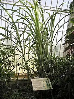 La canne à sucre est une grande graminée (Poaceae) tropicale herbacée à port de roseau, d'une hauteur allant de 2,5 à 6 mètres[4]. Les tiges, d'un diamètre de 1,5 à 6 cm, sont pleines[5]. Les feuilles, alternes, sont réparties en deux files opposées et ont un limbe de 1 m de long environ sur 2 à 10 cm de large pesant environ 300 g et plus. Elles sont au nombre de dix sur les plantes en pleine croissance, la partie inférieure de la tige se dénudant au fur et à mesure que les feuilles basses se dessèchent.