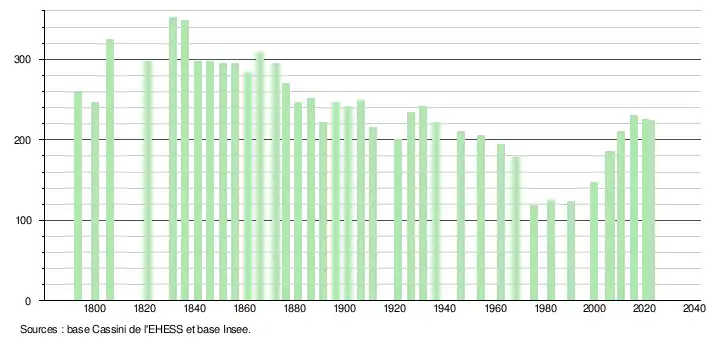 L'évolution du nombre d'habitants est connue à travers les recensements de la population effectués dans la commune depuis 1793. Pour les communes de moins de 10 000 habitants, une enquête de recensement portant sur toute la population est réalisée tous les cinq ans, les populations de référence des années intermédiaires étant quant à elles estimées par interpolation ou extrapolation[32]. Pour la commune, le premier recensement exhaustif entrant dans le cadre du nouveau dispositif a été réalisé en 2005[33].