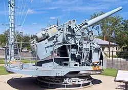 Le canon à double usage Mark 37 de 5 pouces/38 calibres exposé au Musée national de la guerre du Pacifique. Le canon avait une portée de plus de 6 miles et pouvait tirer 22 coups par minute.