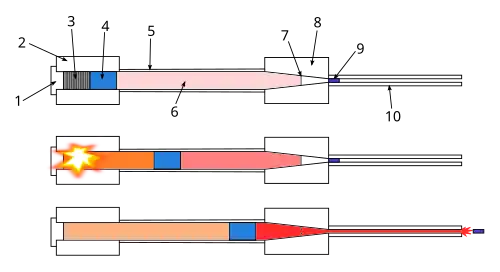 La poudre à canon (3) est contenue dans la chambre de combustion (2) elle-même fermée par la culasse (1). Cette dernière va propulser le piston (4) comprimant ainsi le gaz (6) contenu dans le tube de compression (5). Cette pression a pour effet de rompre le diaphragme (7) placé dans le convergent (8). Les pressions et températures élevées atteintes par le gaz permettent d’en augmenter la vitesse de détente. Le gaz passe alors dans le tube de lancement (10) dans lequel se trouve le projectile (9) à accélérer.