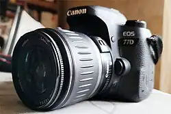 Le Canon EOS 77D, appelé Canon EOS 9000D au Japon, est un appareil photographique reflex numérique de 24,2 mégapixels fabriqué par Canon et annoncé en [1]. Il remplace le Canon EOS 760D. Comme ce dernier, le 77D se distingue du 800D par une ergonomie empruntée aux modèles de la gamme supérieure: écran LCD sur la face supérieure, seconde molette de contrôle sur la face arrière et sélecteur de modes sur la gauche.