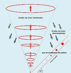 - fragmentation des embryons de grêle et donc multiplication des noyaux de congélation. Ceci aurait pour effet d'empêcher les grêlons de grossir et d'atteindre, pendant leur chute, une inertie trop importante qui pourrait les rendre dangereux (ce principe est le même que pour les ensemencements de nuages à iodure d'argent mais serait obtenu par onde de choc).