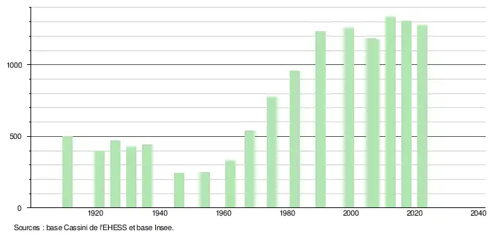 L'évolution du nombre d'habitants est connue à travers les recensements de la population effectués dans la commune depuis 1911. Pour les communes de moins de 10 000 habitants, une enquête de recensement portant sur toute la population est réalisée tous les cinq ans, les populations de référence des années intermédiaires étant quant à elles estimées par interpolation ou extrapolation[17]. Pour la commune, le premier recensement exhaustif entrant dans le cadre du nouveau dispositif a été réalisé en 2007[18].