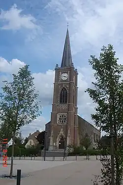 - Église Saint-Martin. La première église, bâtie en 1149, est ensuite vendue en 1379 et sert à la construction du beffroi. Le chœur, datant du XIIIe siècle, se situe à l'emplacement de l'ancien château. Restauré tout d'abord au XVIe siècle, l'église subit de nombreuses modifications en 1778 et 1829. En 1858, son clocher en grès du XVIe siècle est remplacé par une tour néo-gothique[14]