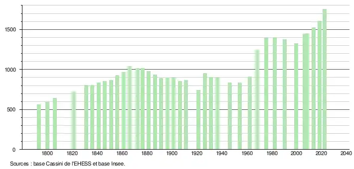 L'évolution du nombre d'habitants est connue à travers les recensements de la population effectués dans la commune depuis 1793. Pour les communes de moins de 10 000 habitants, une enquête de recensement portant sur toute la population est réalisée tous les cinq ans, les populations de référence des années intermédiaires étant quant à elles estimées par interpolation ou extrapolation[35]. Pour la commune, le premier recensement exhaustif entrant dans le cadre du nouveau dispositif a été réalisé en 2008[36].