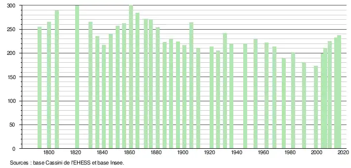 L'évolution du nombre d'habitants est connue à travers les recensements de la population effectués dans la commune depuis 1793. Pour les communes de moins de 10 000 habitants, une enquête de recensement portant sur toute la population est réalisée tous les cinq ans, les populations de référence des années intermédiaires étant quant à elles estimées par interpolation ou extrapolation[8]. Pour la commune, le premier recensement exhaustif entrant dans le cadre du nouveau dispositif a été réalisé en 2004[9].