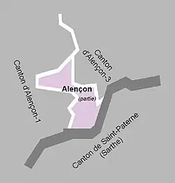 La partie de la commune d'Alençon intégrée dans le canton est celle située au sud d'une ligne définie par l'axe des voies et limites suivantes : depuis la limite territoriale de la commune de Saint-Germain-du-Corbéis, avenue de Koutiala, rue de Guerame, place Candie, rue Candie, rond-point, rue Antoine-Jullien, place du Commandant-Daniel-Desmeulles, cours Georges-Clemenceau, Grande-Rue, rue du Pont-Neuf, cours de la Sarthe, boulevard de la République, rue de la Fuie-des-Vignes, ligne de chemin de fer, cours de la Sarthe, jusqu'à la limite territoriale de la commune de Saint-Paterne.