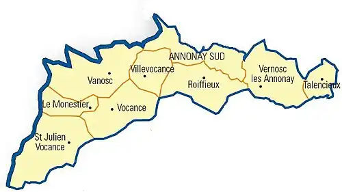 - ↑ Liste des communes du canton d'Annonay-Sud sur le site de l'Insee, consulté le 19 janvier 2015.