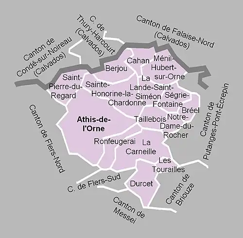 Lors du redécoupage de 2014, le canton d'Athis-de-l'Orne comprenait quarante-cinq communes entières[1].
