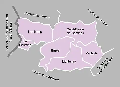 Contrairement à beaucoup d'autres cantons, le canton d'Ernée n'incluait dans son territoire antérieur à 2015 aucune commune supprimée depuis la création des communes sous la Révolution[18].