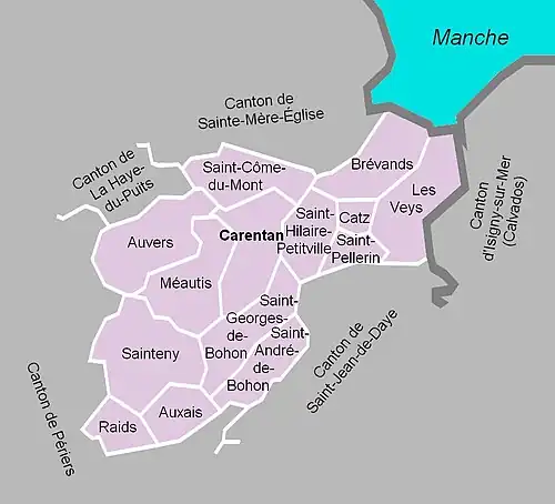 À la suite du redécoupage des cantons pour 2015, toutes les communes à l'exception d'Auxais et Raids sont rattachées à nouveau au canton de Carentan auquel s'ajoutent les vingt-six communes du canton de Sainte-Mère-Église, quatre communes du canton de La Haye-du-Puits et une du canton de Périers. Les communes d'Auxais et Raids sont intégrées au canton d'Agon-Coutainville.