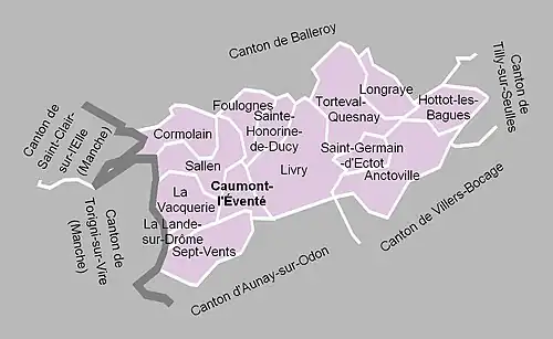 Les anciennes communes suivantes étaient incluses dans le territoire de canton de Caumont-l'Éventé[5] :