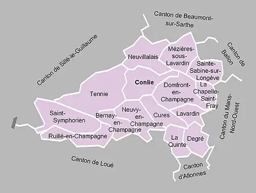 Les anciennes communes suivantes étaient incluses dans le canton de Conlie[9] :