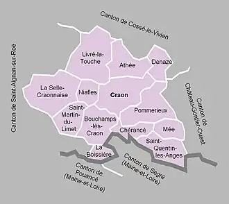 À la suite du redécoupage des cantons pour 2015, les communes de Bouchamps-lès-Craon, Chérancé, Craon, Denazé, Mée, Niafles, Pommerieux et Saint-Quentin-les-Anges sont rattachées au canton de Château-Gontier et les communes d'Athée, La Boissière, Livré-la-Touche, Saint-Martin-du-Limet et La Selle-Craonnaise à celui de Cossé-le-Vivien.