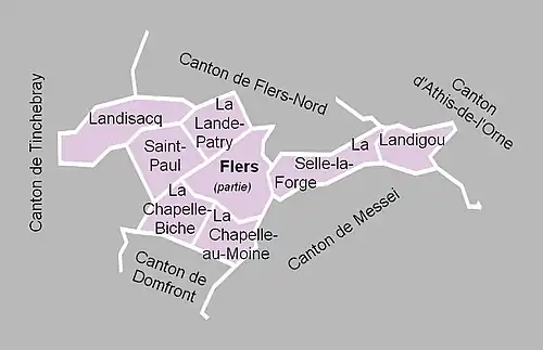 À la suite du redécoupage des cantons pour 2015, les communes de La Chapelle-au-Moine, La Chapelle-Biche, La Lande-Patry, Landisacq et Saint-Paul sont rattachées au canton de Flers-1, les communes de Landigou et La Selle-la-Forge à celui de Flers-2. La partie de la commune de Flers de ce canton est rattachée totalement au canton de Flers-1.