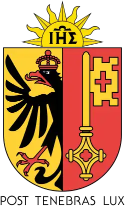 Le canton de Genève a pour emblèmes un drapeau et un blason. Les armoiries de Genève se blasonnent : Parti, en 1, d’or, au demi-aigle bicéphale de sable, armée, languée et couronnée de gueules et en 2, de gueules, à la clé d’or, posée en pal[49]. La devise cantonale est Post tenebras lux.