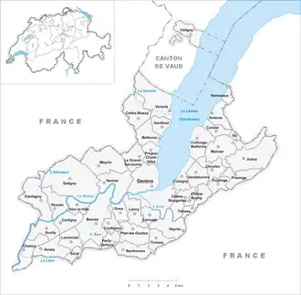 Situé à l'extrémité occidentale de la Suisse, au bout du Léman, le canton de Genève partage plus de 95 % de ses frontières avec la France (103 km contre 4,5 km si l'on exclut les frontières dans le canton de Vaud avec les exclaves de la commune de Céligny)[13]. Il est entouré des départements de l'Ain à l'ouest, et de la Haute-Savoie à l'est et au sud, ainsi que du canton de Vaud au nord, dans lequel est enclavée la commune genevoise de Céligny.