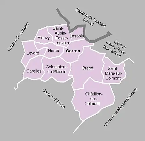 À la suite du redécoupage des cantons pour 2015, toutes les communes sont rattachées au nouveau canton de Gorron auquel s'ajoutent les neuf communes du canton de Landivy, six communes du canton d'Ambrières-les-Vallées et une du canton de Mayenne-Ouest.