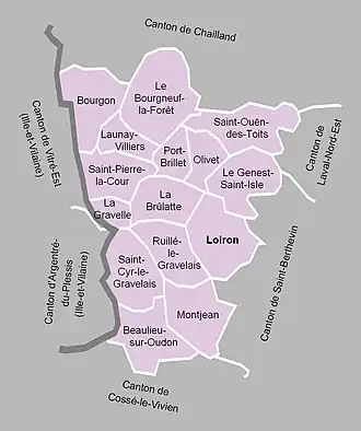 À la suite de la création de la commune nouvelle de Loiron-Ruillé au par regroupement de Loiron et de Ruillé-le-Gravelais[20], le canton compte désormais quatorze communes.
