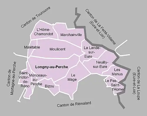 Les anciennes communes suivantes étaient incluses, entièrement ou partiellement, dans le canton de Longny-au-Perche[13] :