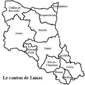Depuis 2014, les communes du canton de Lunas sont rattachées soit au canton de Clermont-l'Hérault pour 9 communes (Avène, Le Bousquet-d'Orb, Brenas, Ceilhes-et-Rocozels, Dio-et-Valquières, Joncels, Lunas, Mérifons et Octon) soit au canton de Lodève pour 3 communes (Lavalette, Romiguières, Roqueredonde).