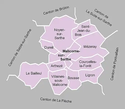 À la suite du redécoupage des cantons pour 2015, les communes d'Arthezé, Bousse, Courcelles-la-Forêt, Ligron et Villaines-sous-Malicorne sont rattachées au canton de La Flèche, les communes de Malicorne-sur-Sarthe, Mézeray et Saint-Jean-du-Bois à celui de La Suze-sur-Sarthe, la commune de Noyen-sur-Sarthe à celui de Loué et les communes du Bailleul et Dureil à celui de Sablé-sur-Sarthe.